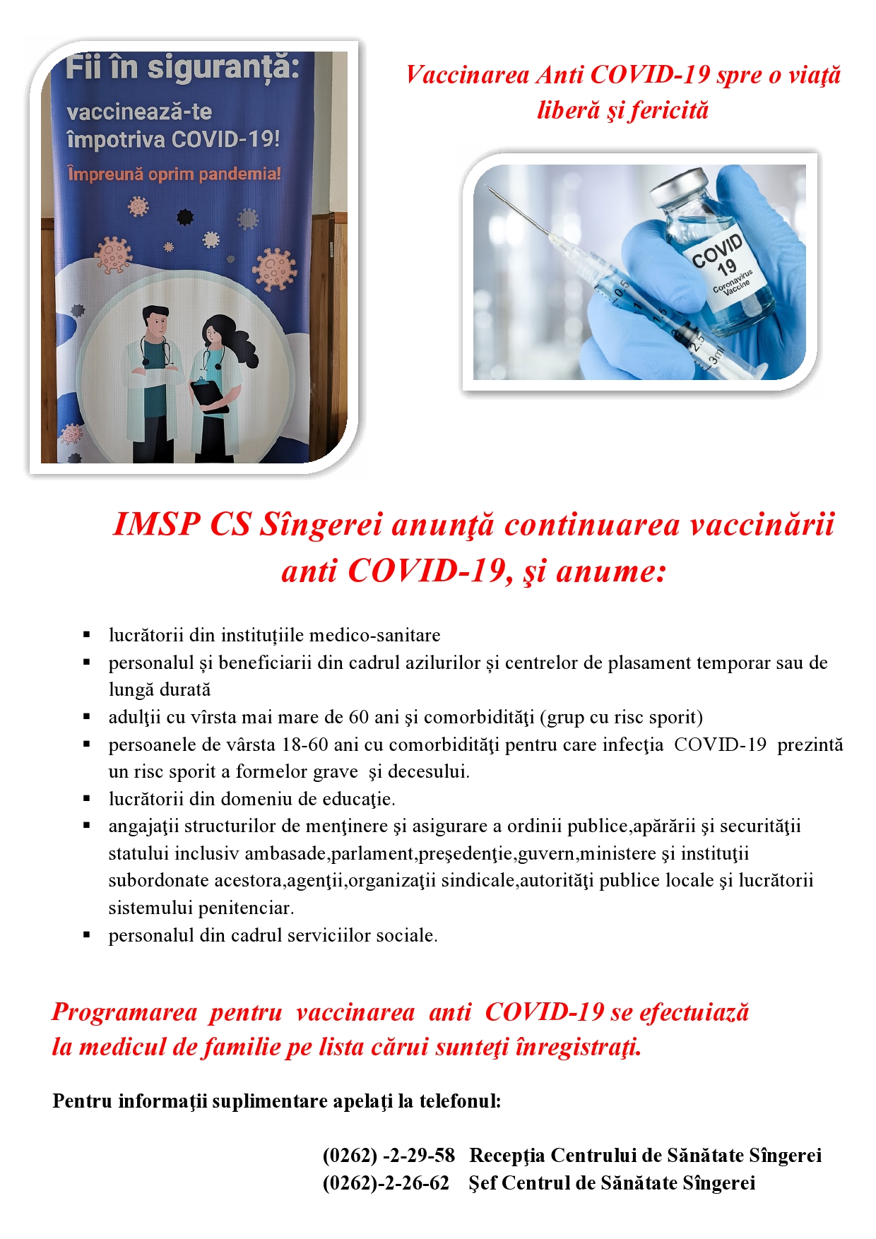 IMSP CS Sîngerei anunţă continuarea vaccinării anti COVID-19