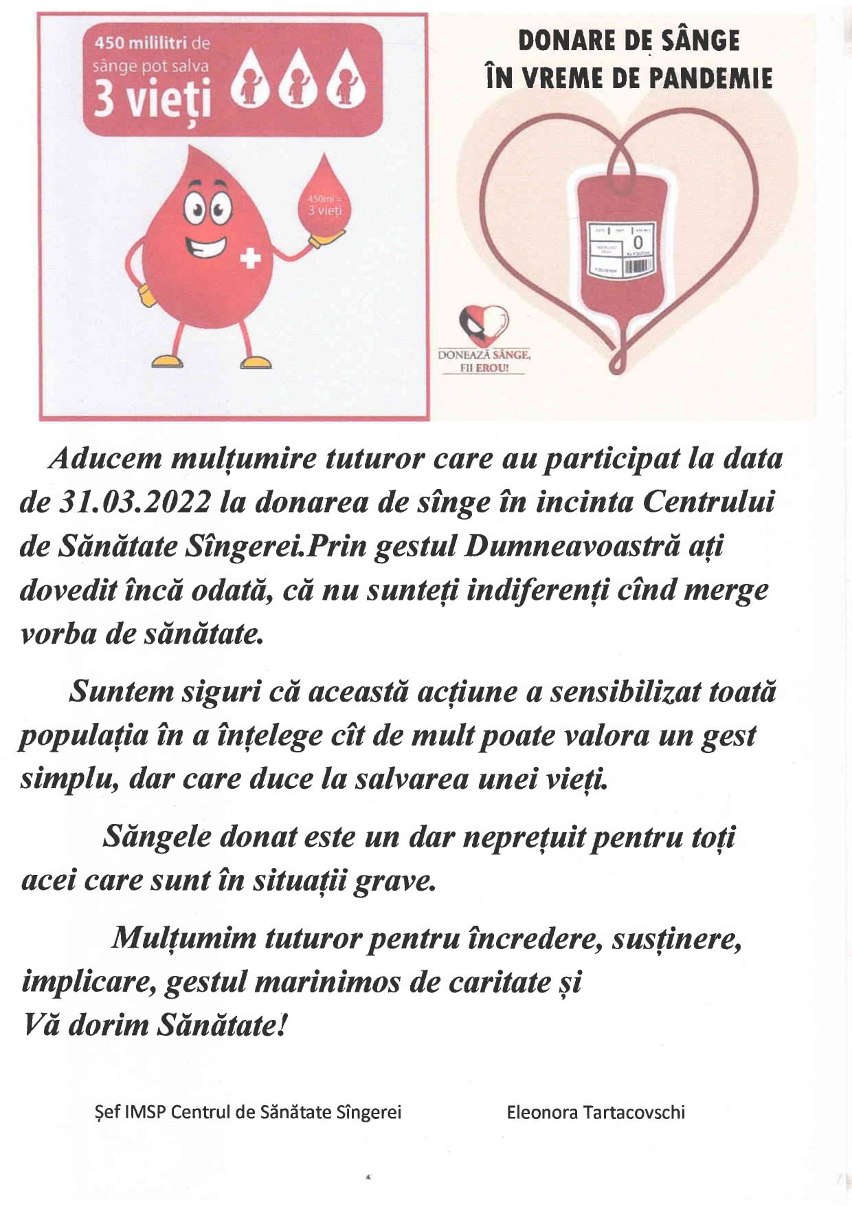IMSP Centrul de Sănătate Sîngerei oferă servicii / consultații medicale gratuite persoanelor refugiate din Ucraina, în programul orelor de lucru.