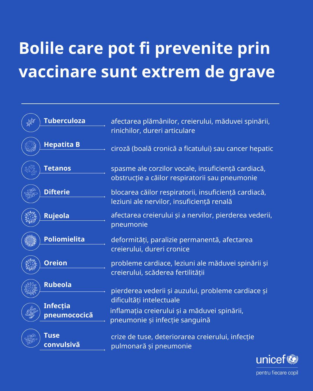 Nu toate bolile care pot fi prevenite prin vaccinare sunt la fel – dar toate sunt extrem de periculoase pentru copii. Unele boli sunt fatale, altele lasă copiii cu dizabilități pe viață, iar unele pot cauza complicații pe termen lung.
